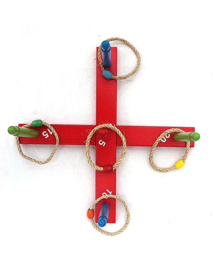 A Fun Game for All Ages and a Great Way to Unplug Your Kids. The Classic Ring Toss Game Set is a great way to get the entire family interacting and having good old-fashioned fun. Its compact size and easy portability make it a perfect choice for you to take on vacations, picnics, tailgating, camping, birthday parties, and game nights.This vintage ring toss game includes color-coded dowels with different point assignments, braided rope rings.The game features a solid wood target base that requires no ground staking.Size 16.5 x 16.5 inch