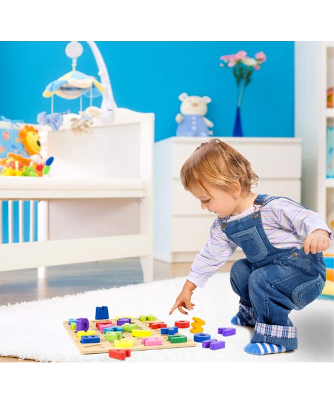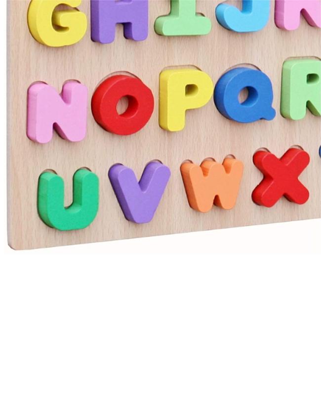 Fun Education Tool.Great Learning Toy,Including 26 uppercase letters to fit into a wooden puzzle board..Smooth wooden alphabets painted with bright colors: red, yellow, blue, green ,purple.Develops fine motor skills, shape orientation, and letter recognition.For Children ages 3 and up,.The board is approx :11.75"long, 9"wide